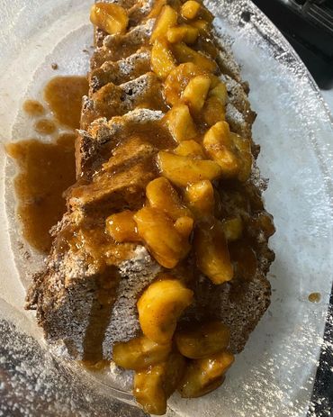Signature banana bread with rum butter walnut sauce on bottom (can omit walnuts for allergy) brulee banana served on top of creme brulee. A textured symphony in your mouth.